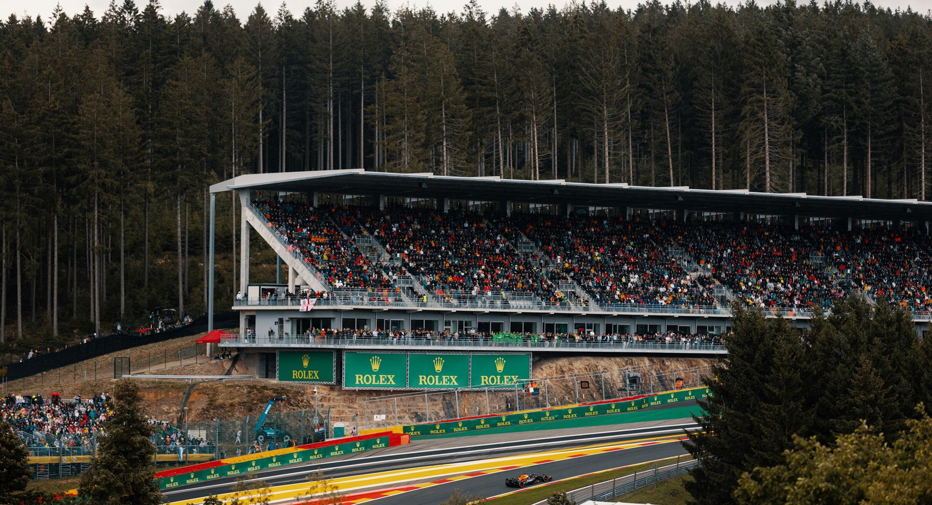 La tribune Gold 3 trone au sommet du Raidillon. Cette tribune permanente et couverte offre au visiteurs une vue epoustouflante de la sortie de la Source jusqu'au sommet du Raidillon. Sa localisation en fait un incontournable pour les amateurs de Formule 1.